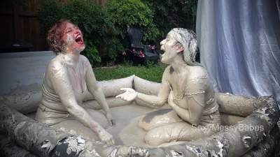 "Curvy redhead and brunette sensually play with each other in the mud."